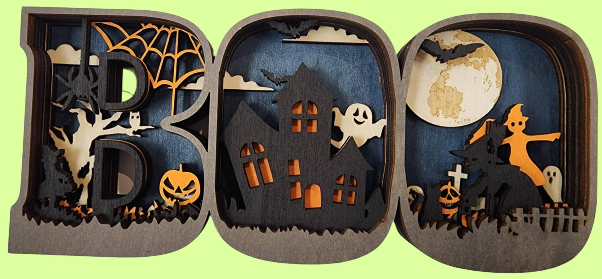 This layered wood design features the word BOO spelled out with a spooky, Halloween scene. back is plain
