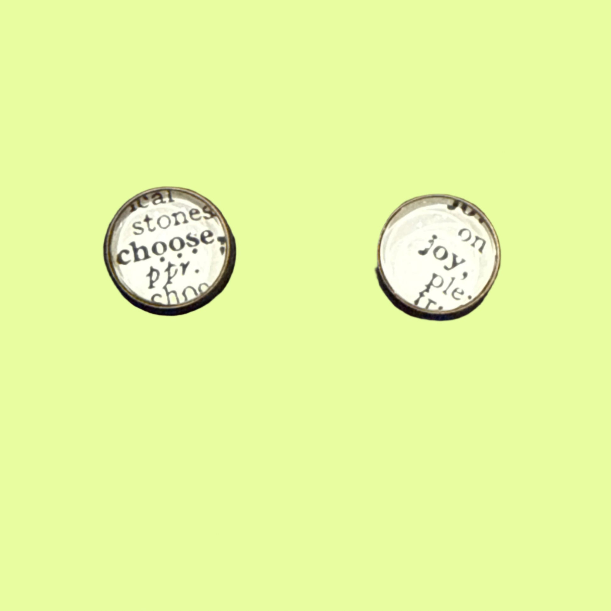 Glass cabochon with vintage dictionary word 'choose' on one earring and 'joy' on the other. Antique Bronze