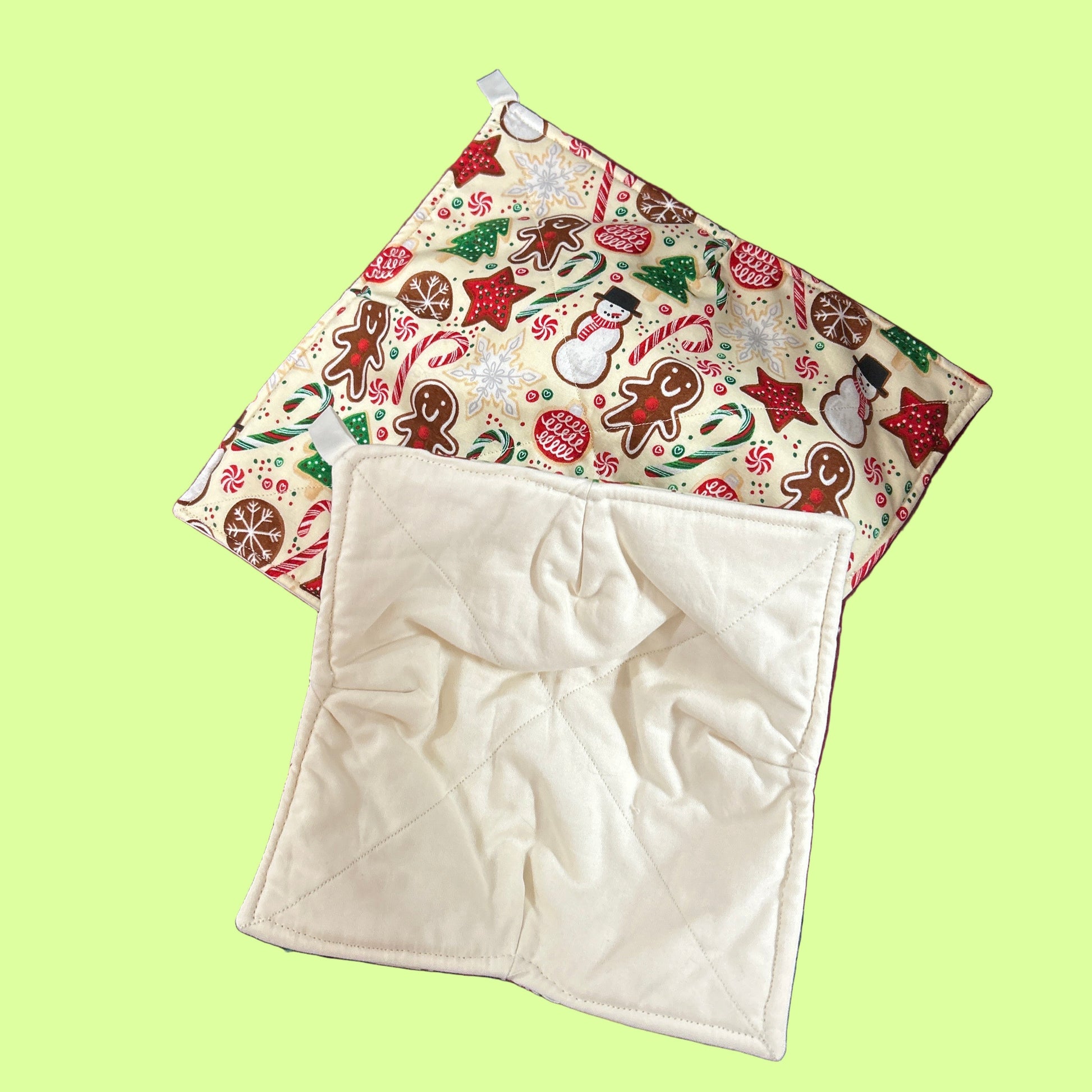 Just place your bowl or plate on this fun cozy, into the microwave it goes. Ding! Open the door and just cup your hands around the cozy or its corners and take out. So easy. You can carry straight from microwave to table (or lap).