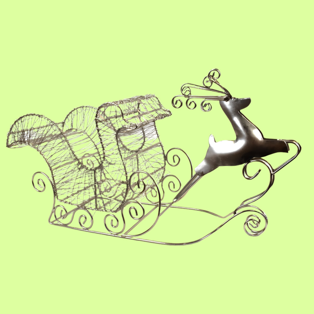 Gorgeous metal sleigh with reindeer. This sleigh features a heavy duty frame with the traditional wrapped wire style that everyone loves. Accented by a beautiful hand-cut reindeer this sleigh will make a perfect statement on your mantle this holiday season. You can even dress it up with some twinkling lights or add some tiny present boxes to the sleigh. Made from a sturdy metal base and wrapped in metal wire.Great for mantle decoration Soldered for durability