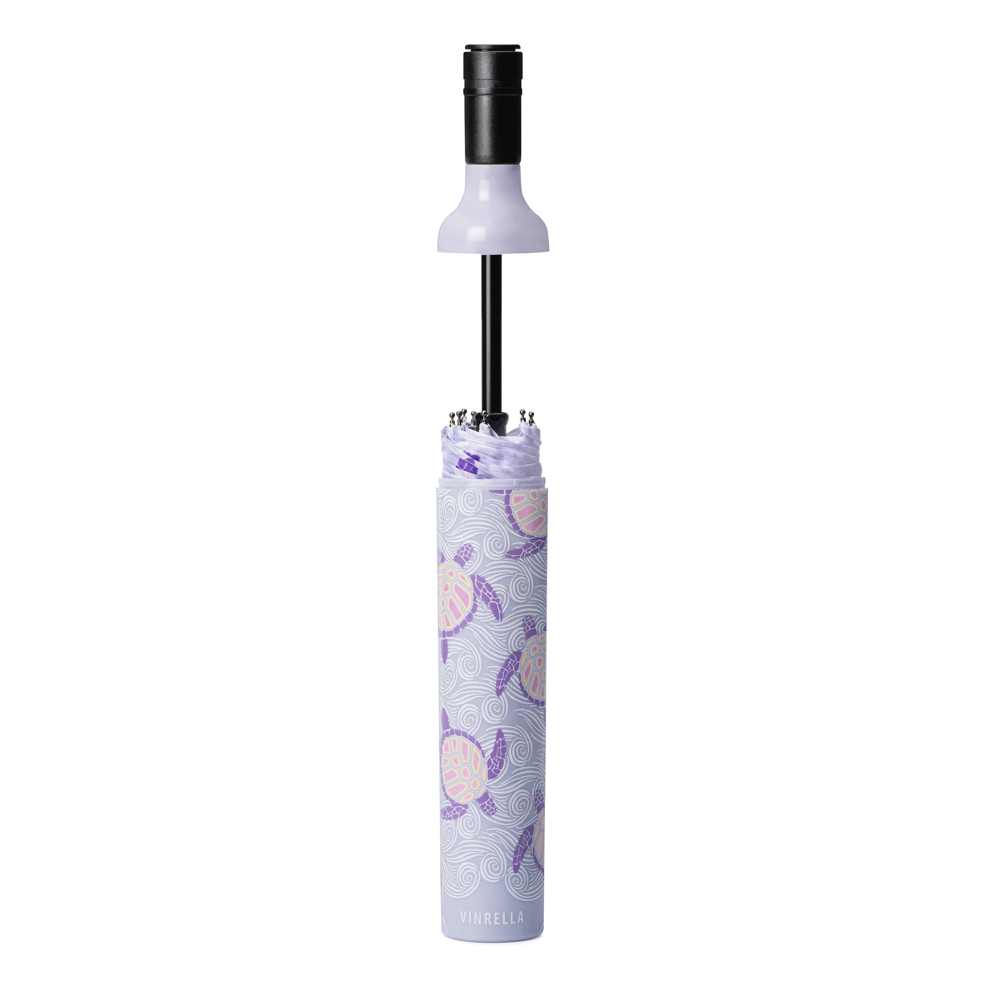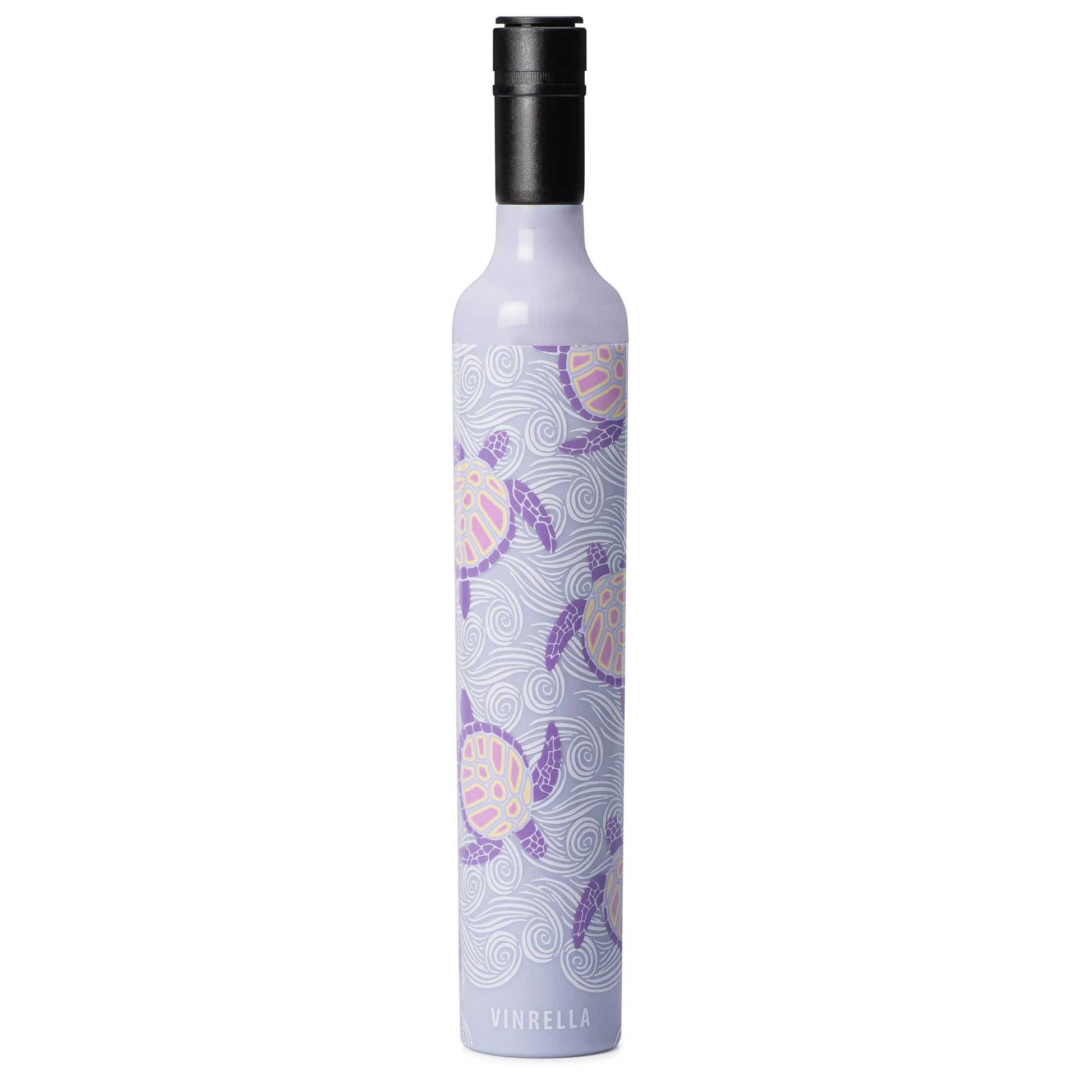 Introducing Tortuga, an umbrella inspired by the mesmerizing beauty of sea turtles. Its captivating hues of purple and intricate design are guaranteed to catch the eye of anyone around. All Vinrella wine bottle umbrellas have a no-drip design to seal your wet umbrella in the bottle and protect your purse, backpack or briefcase.